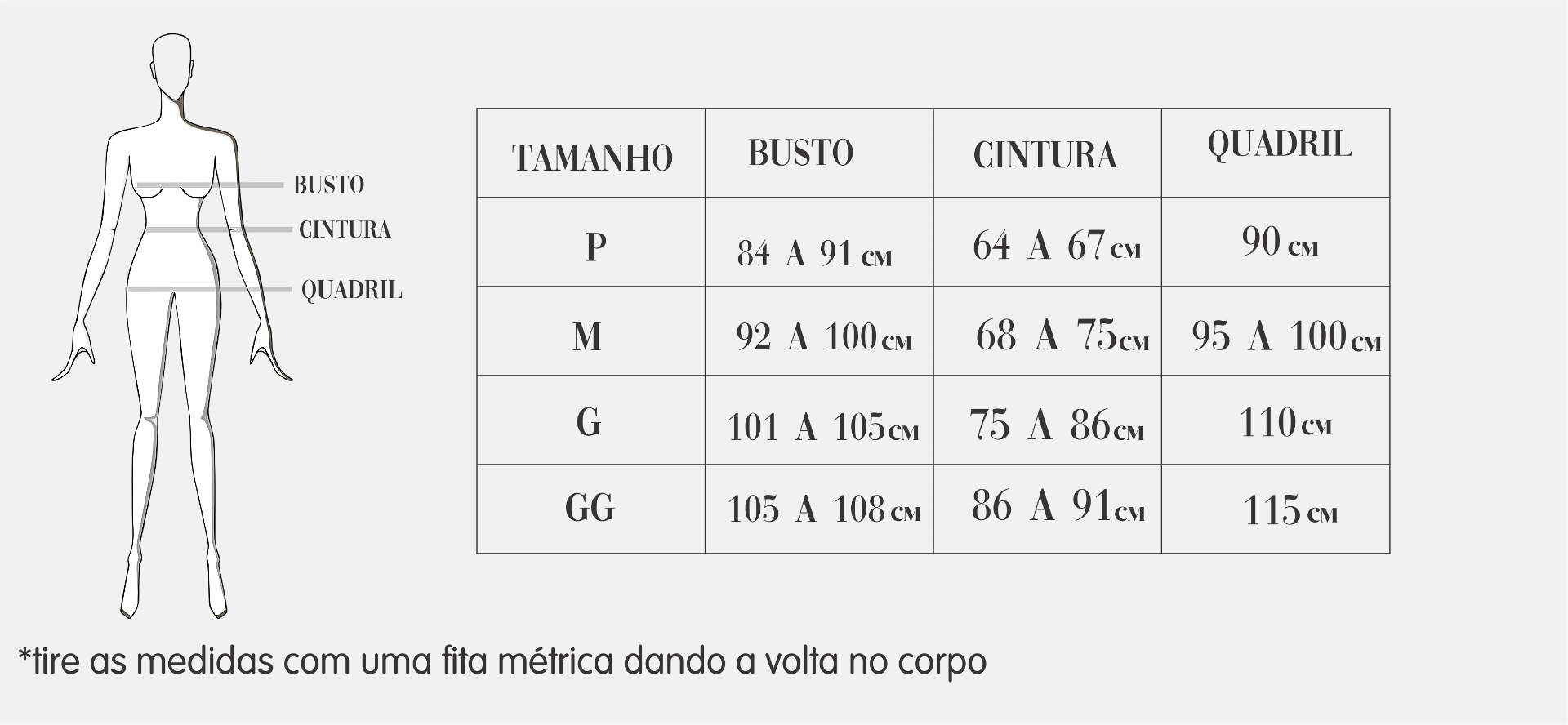 Para confirmar o tamanho, confira a nossa tabela de medidas do corpo abaixo.